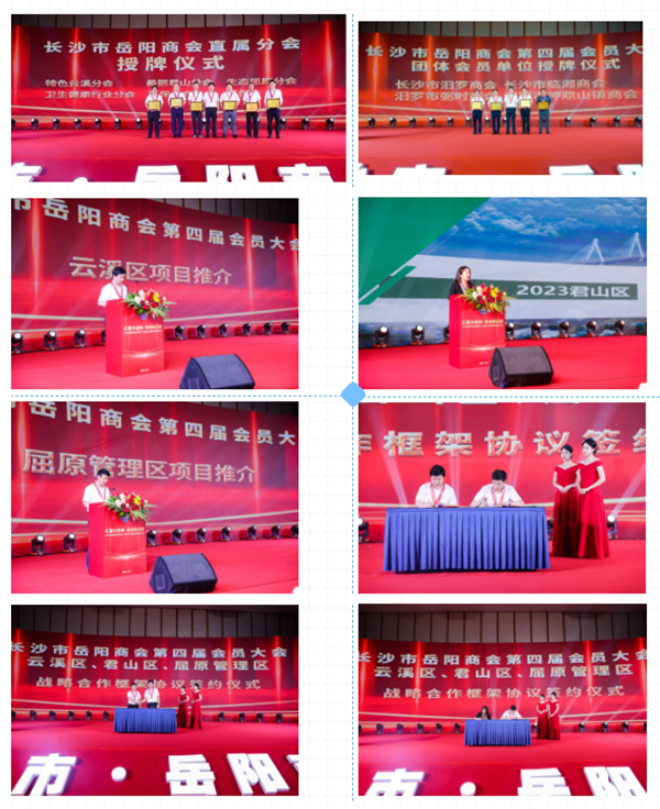 商會(huì)黨委副書記、執(zhí)行會(huì)長(zhǎng)黃政偉宣讀《關(guān)于成立長(zhǎng)沙市岳陽商會(huì)特色云溪分會(huì)、美麗君山分會(huì)、生態(tài)屈原分會(huì)、青創(chuàng)會(huì)的決定》,黨委書記、會(huì)長(zhǎng)李志兵為各分會(huì)、青創(chuàng)會(huì)和團(tuán)體會(huì)員單位汨羅商會(huì)、臨湘商會(huì)、弼時(shí)商會(huì)、神鼎山鎮(zhèn)商會(huì)授牌,并分別與云溪區(qū)委常委、常務(wù)副區(qū)長(zhǎng)彭偉、君山區(qū)人民政府副區(qū)長(zhǎng)張潔、屈原管理區(qū)管委會(huì)副主任陳學(xué)禮簽訂《戰(zhàn)略合作框架協(xié)議》。云溪區(qū)委常委、常務(wù)副區(qū)長(zhǎng)彭偉、君山區(qū)人民政府副區(qū)長(zhǎng)張潔、屈原管理區(qū)黨委書記向科軍分別在大會(huì)上推介了各區(qū)的項(xiàng)目。